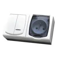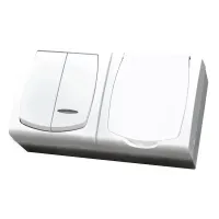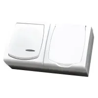 MADERA Zestaw Łącznik dwugrupowy świecznikowy z podświetleniem + Gniazdo pojedyncze wieczko przezroczyste, kolor: BIAŁY, 10AX/16A/250~, IP-44 zaciski gwintowe